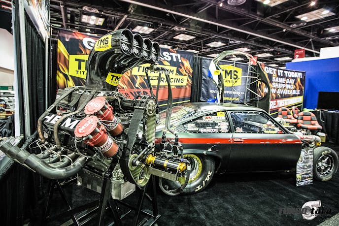 The TMS Titanium booth displayed this gnarly Nitro Top Fuel Hemi motor. A 14-71 blower crams over 3000-CFM of air into the engine, while dual magnetos ignite the nitro. These engines consume over 11 gallons of nitromethane per second.