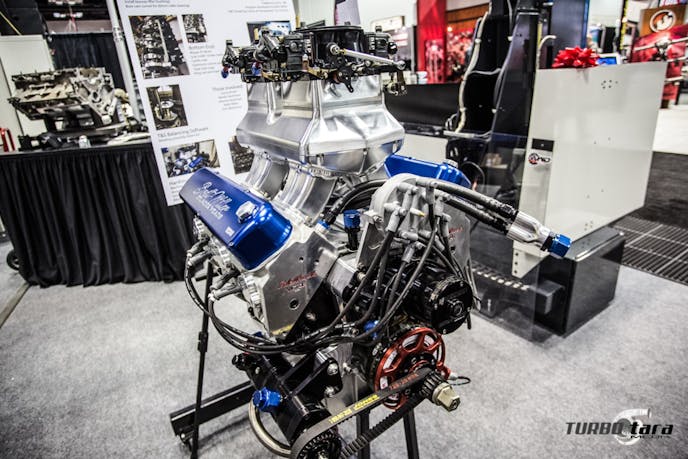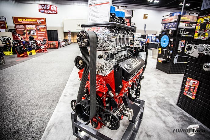 Hameetman Racing Engines (HRE) brought their big-block Chevy engine blown by The Blower Shop. It’s equipped with all the necessary fittings and brackets from Moroso and was proudly displayed at their booth.