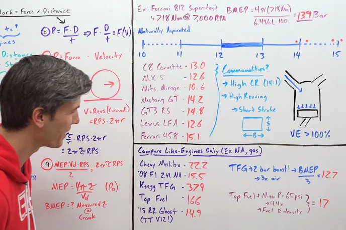 But, you can compare the absolute numbers to garner general ideas about different engines. To make that point, he calculates the BMEP of the 6.6-liter twin-turbo V12 Rolls-Royce Ghost engine to be 14.9 — WITH the boost, showing just how impressive some higher-end N/A engines are by comparison.