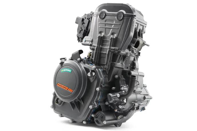 While the previous engine is almost 30 years old at this point, the high-revving four-stroke single-cylinder engine is alive and well in the 20th century as evidenced by the popularity of the 10,000-plus-rpm Duke engine. With an 89mm (3.504 inches) bore and 60mm (2.362 inches) stroke, it only measures in at 373cc of displacement, but makes its peak power of 44 horsepower at 9,500 rpm.