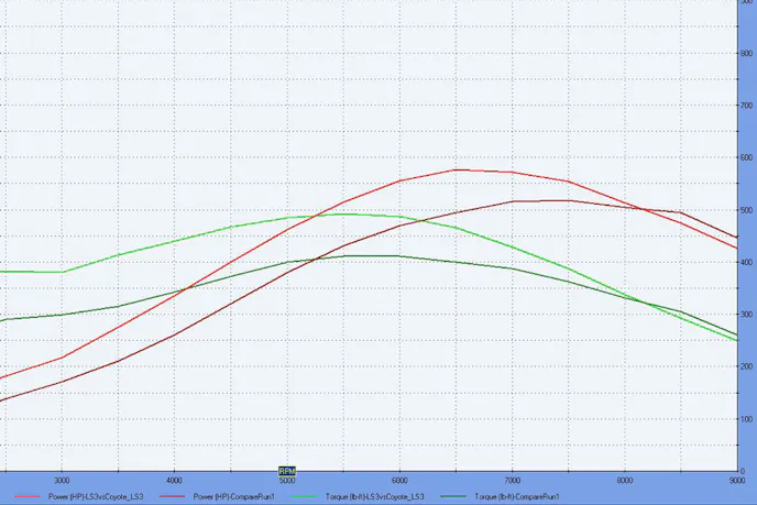 The result of all this was something no one really expected, and that was an LS engine with a very similar power curve to the Coyote engine, and only falling off in the top end, presumably finding the limits of the stock 799 heads modeled. Besides being an extremely fun article to write, we also found a reliable took in the DynoSim5 software.