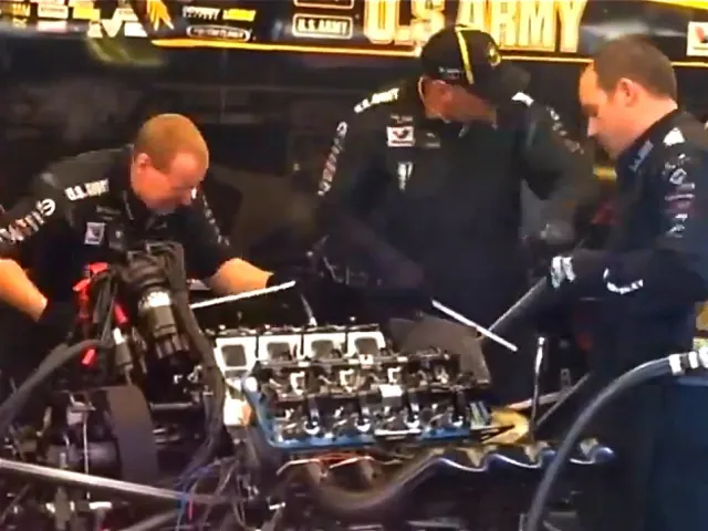 This time-lapse video was produced using an app called YouTube Capture, and it shows the U.S. Army crew for Tony Schumacher performing the routine teardown and rebuild of a Top Fuel engine between races. It’s a well choreographed exercise necessary to check over an engine that practically destroys itself in less than four seconds by igniting about eight gallons of nitromethane. The engine is completely disassembled, parts checked and replaced when necessary. Also, the clutch discs are removed and resurfaced.