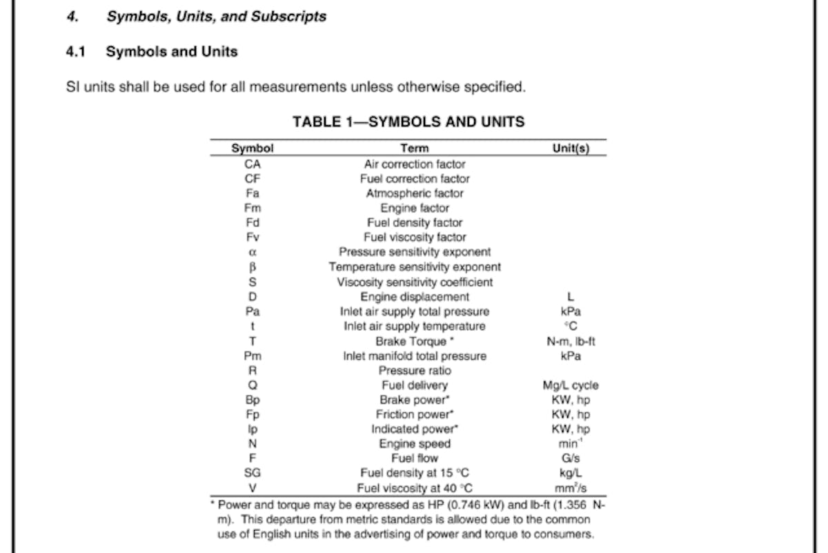 The industry standard for measuring an engine’s power output is SAE Standard J1349, which is the standard adopted by SAE to specify a basis for net engine power and torque ratings. “SAE standard J1349, Table 1 lists the units of measure used in the standard as “N-m or lb-ft” for torque and “kW or hp” for the horsepower ratings,” says Gary W. Pollak, P.E., Program Manager for the Society of Automotive Engineers.