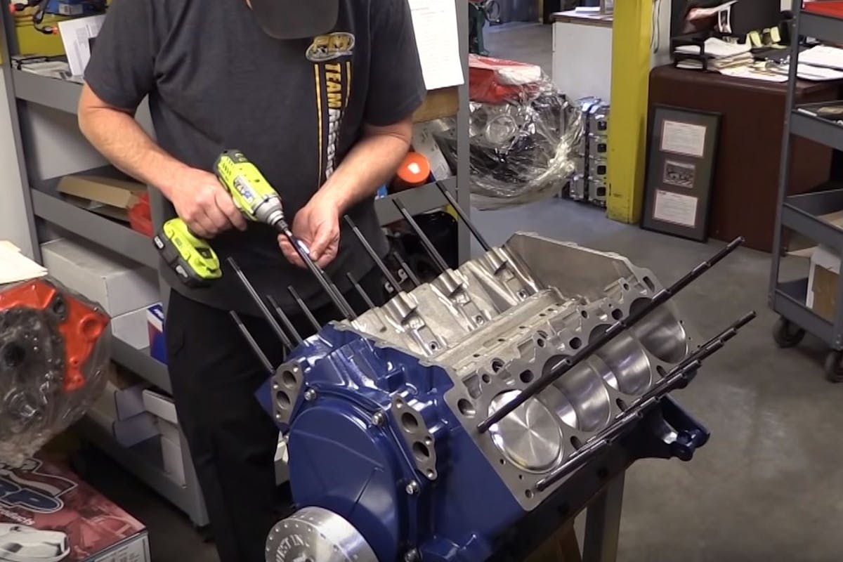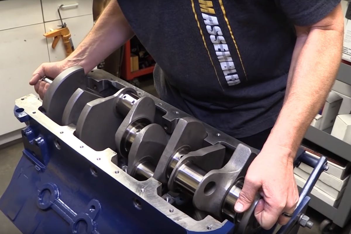 The first step after a careful bore, hone, and thorough cleaning is the installation of the rotating assembly. The Clevite bearings were installed, crank seated properly, and a couple of tricks were used on the main caps. With studs installed, the caps are seated with a dead-blow hammer versus tightening down the nuts, and the side bolts get a dab of silicone to ensure no oil gets pushed out the side of the block. The mains are torqued 100 lb-ft and the side bolts to 75 lb-ft to button it all up.