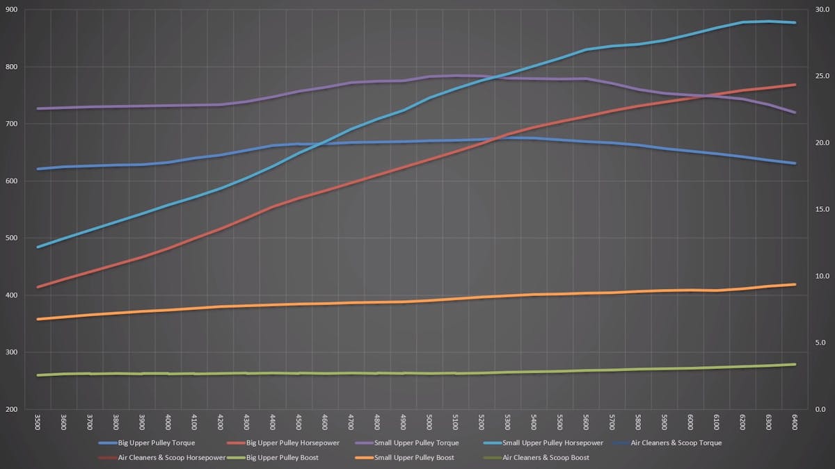 “We bored and strokes a 426 HEMI to 572 cubic inches and then throw a big 8-71 blower on top,” says Huneycutt. “On the engine dyno, we also tested how different pulley ratios affect boost and power. Finally, we tested how adding the Blower Drive Shop scoop and air filters affect power.”