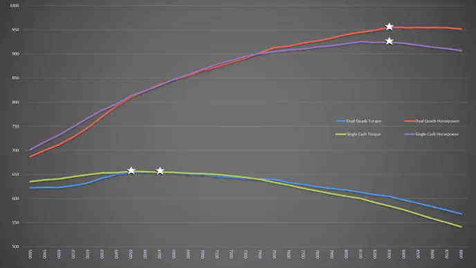 Since the R07 has no provisions for an internal oil pump, a six-stage dry-sump system was fitted for the dyno session. A set of race-style 1-7/8-inch stepped-primary headers were fitted for the dyno testing, as well. Once broken in, the engine was spun all the way up to 8,800 rpm on the dyno, with impressive results. The dual-quad setup yielded a peak of 955.1 horsepower at 8,300 rpm and 655.5 lb-ft of peak torque at 6,700 rpm.
