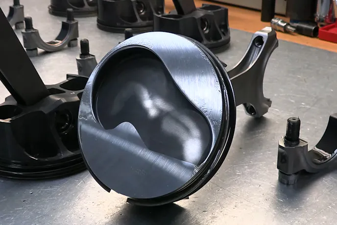 Of course, since this is still a high-end build, high-end custom pistons are being used. 4.190-inch forged 2618 pistons from MAHLE are fully coated to reduce friction and feature a reverse dome milled into the crown to bring compression down to a manageable 12:1 while also acting as a valve relief. While piston ring specs aren’t disclosed you can see in the video that they are super low tension, ultra-thin pieces, as evidenced by the complete lack of effort required to get the piston into the bore.