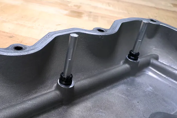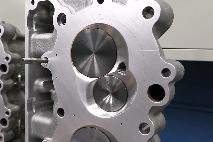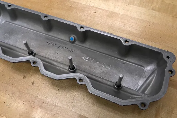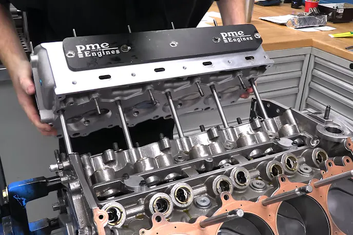 Sixteen head studs sit in the block, along with another four which thread into each head, and are secured to external flanges on the block. The 20 fasteners per bank provide the clamp load and sealing comes from a set of copper-sprayed multi-layer steel head gaskets. Topping the heads off is a set of cast aluminum valve covers with built-in spring oilers.