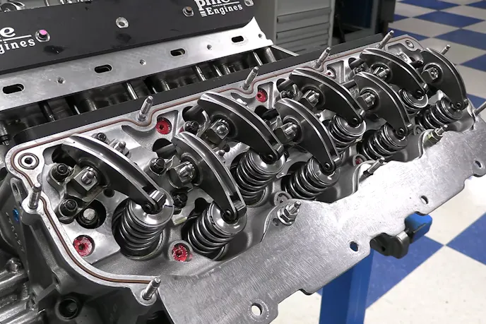 The engine uses .935-inch solid-roller keyway lifters, which are guided by keyed bronze lifter bushings, in order to handle the aggressive cam lobe designs used in the engine. Double-tapered 7/16-inch pushrods with a .165-inch wall-thickness are used, with a nominal length of 8.000 inches. Between the lifters and the rocker arms.