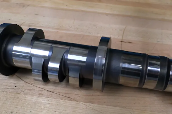 The heart of the valvetrain is the engine’s NASCAR-based solid-roller camshaft. With narrowed lobes and journals, the billet steel bumpstick has all the friction reduction tricks still in place. It also has the R07’s unique front timing gear, designed to reduce timing changes based on camshaft twist. The specs weren’t shared, exactly, only confirming duration in the 280-degree range and lift just shy of an inch, with a 110-degree lobe separation angle. The camshaft rides in a raise cam tunnel outfitted with roller bearings to further reduce friction and is driven by a fully adjustable cog-belt drive system and outfitted with a carbon fiber front cover.