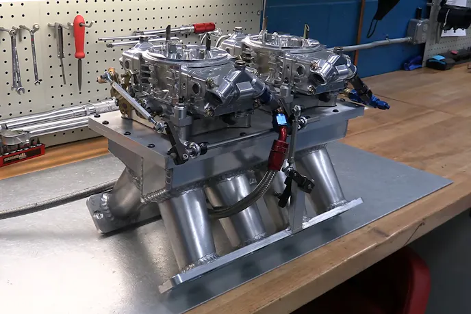 Stepping completely away from the NASCAR mold, the intake manifold is a sheetmetal dual-quad tunnel ram fitted with a pair of out-of-the-box Holley HP 750 carbs and a one-inch open design carb spacer under each carburetor. Underneath the intake manifold sits a cast-aluminum valley cover slash water manifold specific to the R07 cylinder head design.