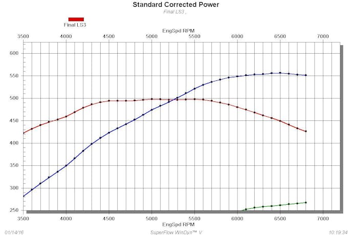 Both motors were built with three key characteristics in mind: Street drivability, top end power, and reliability. On the dyno we can now see the results of those efforts with the GM motor, which generates a flat, meaty torque curve through the mid-range and horsepower that continues to ramp up all the way to 6500 rpm. That should equate to responsive street manners and great top end power at the track.