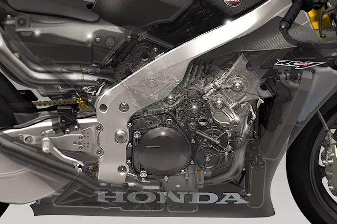 Otherwise, here’s what we know about the liquid-cooled RC213V-S engine. It boasts a wildly oversquare 81 x 48.5 mm (3.190 x 1.909 inches) bore and stroke, 13:1 compression ratio and titanium connecting rods. Throttle-by-wire controls operate 48mm throttle bodies, and the exhaust system features valves to adjust engine braking. The V4 design and 3-journal crankshaft are so cooperative with each other that the harmonic balancer is not needed; thereby reducing mechanical losses. There’s also a sealed crankcase to reduce pumping losses. The valve-timing system is through gears, like on the race bike, but the valves are closed with conventional springs; whereas the race engine features F1-style pneumatic springs. Also, the race bike has a seamless transmission while the street version shifts with a conventional 6-speed gearbox.
