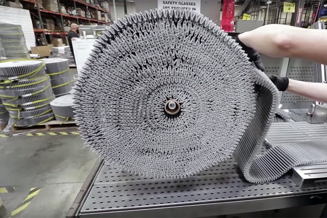 K&N’s air filters are made using a high quality cotton fabric material, similar to medical-grade gauze, which is then encased in an aluminum mesh to reinforce its structure. This process is completed using a machine that was designed and built in-house and was first introduced in 1972. The rolls of material are pulled together through this machine, which then pleats the material into shape.