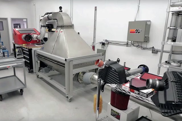 In this lab, K&N has the ability to test a filter’s efficiency by installing it into an OEM airbox or cone filter test bench, and a controlled volume of dirt is injected directly into the airstream. Any dirt that makes it past the test filter is caught by a finer filter in the main vacuum further down the line, where it is then measured to test the actual efficiency of the filter so that it can move on to production or the engineers can go back and make the appropriate changes to the design.