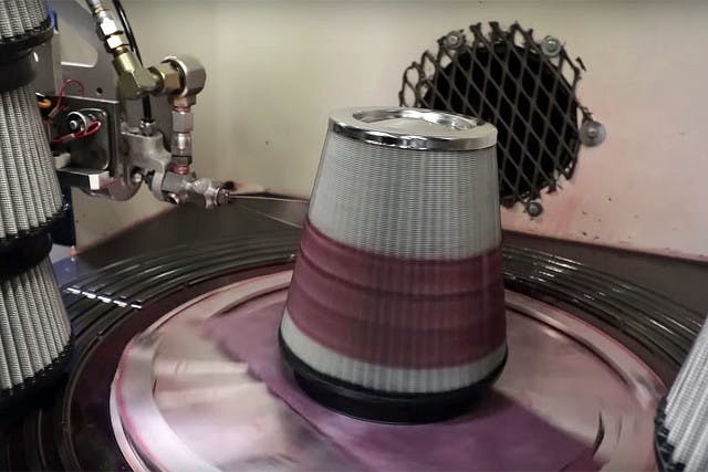 After having what resembles a finished air filter, it is transferred to an oiling machine that coats the filter media in a defined quantity of oil that will spread throughout the cotton material within 20 to 30 minutes, giving it the iconic red color and improved filtration.