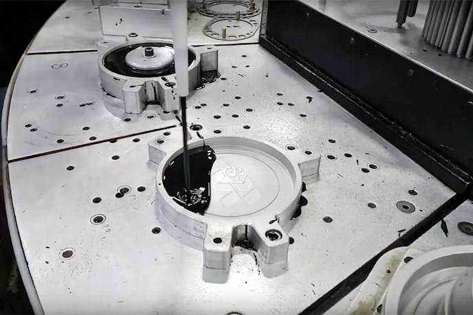 From there, a computer sorts the filter material into bins and collects the correct mold, by application, before being transferred to the molding table for cone filters or a molding machine for panel filters. For cone filters, the aluminum molds are secured to a heated table where a computer then directs a nozzle to inject the perfect volume of liquid rubber into the mold. An employee then follows behind and carefully places the filter media into the rubber and braces it before letting it cure, the process is then repeated for the inlet side of the filter as well.