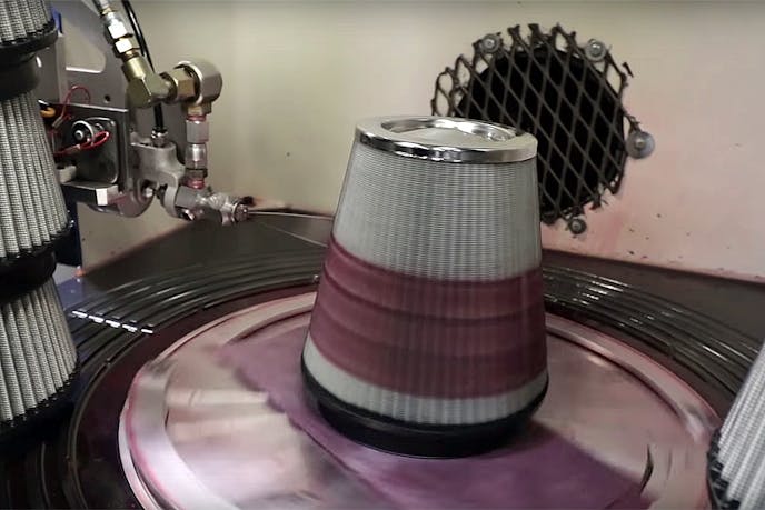 After having what resembles a finished air filter, it is transferred to an oiling machine that coats the filter media in a defined quantity of oil that will spread throughout the cotton material within 20 to 30 minutes, giving it the iconic red color and improved filtration.