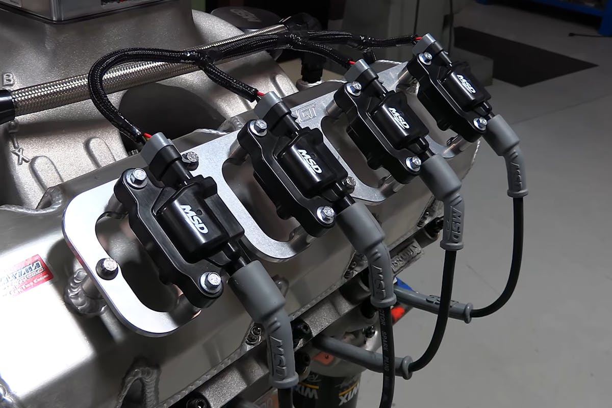 To complement the modern electronics in the Stealth 4500 system, Gibbons opted for an MSD Distributorless Ignition System. The aftermarket coil-per-plug setup is similar to that found on LS engines (in fact, the coil mount bracket is for an LS engine) with a cam position sensor taking the place of the rear-mounted distributor.