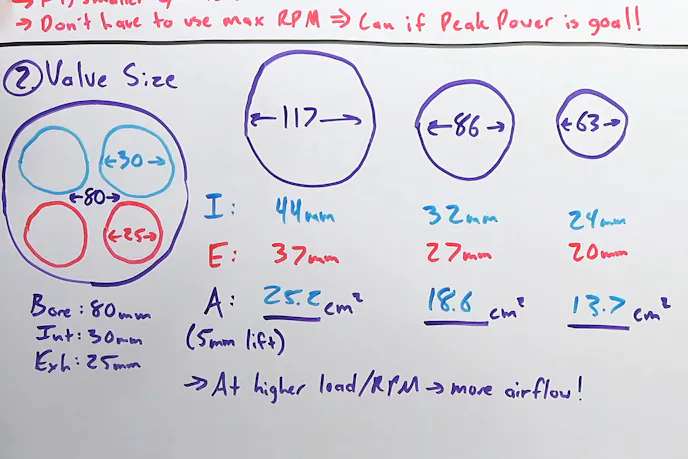 “After scaling, the largest cylinder has two 44mm intake valves versus 24mm intake valves on the small-bore example, and the exhaust valves are 37mm on the large bore example, and 20mm on the smallest. Now, giving these exhaust valves the exact same amount of lift (5mm), the intake valve area of the largest example is about 25.2 square centimeters; he 86mm example is 18.6 sq-cm, and the 63mm bore, you get about 13.7 sq-cm.”
