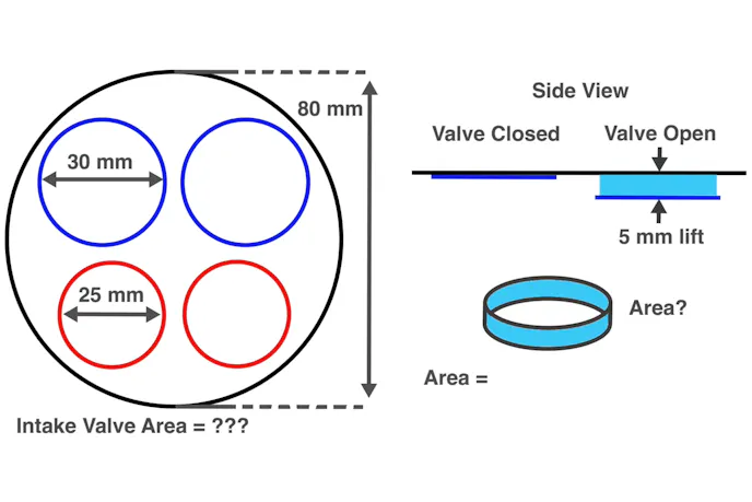 “Starting with an example of an 80mm-bore engine, we’ll say it has two 30mm intake valves and two 25mm exhaust valves. Using that example, we’ll scale it to our cylinder examples,” Fenske postulates.