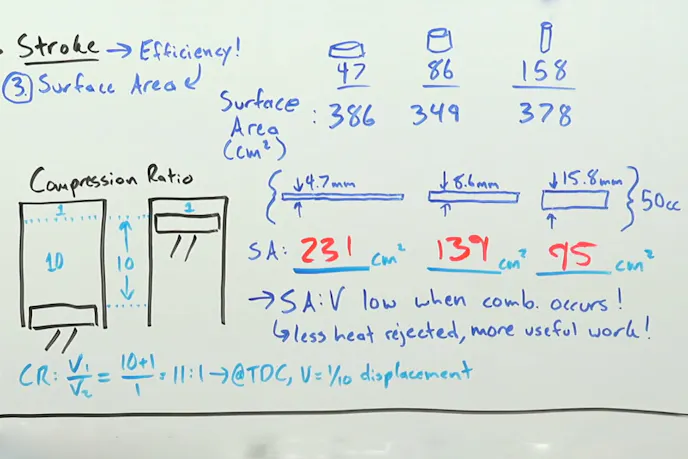 “The undersquare cylinder is actually the closest to square (at the time of combustion) in this example. Running the numbers at the point of combustion, you see that the long-stroke cylinder has the least amount of surface area, and is now turning the most heat from combustion into usable work.”