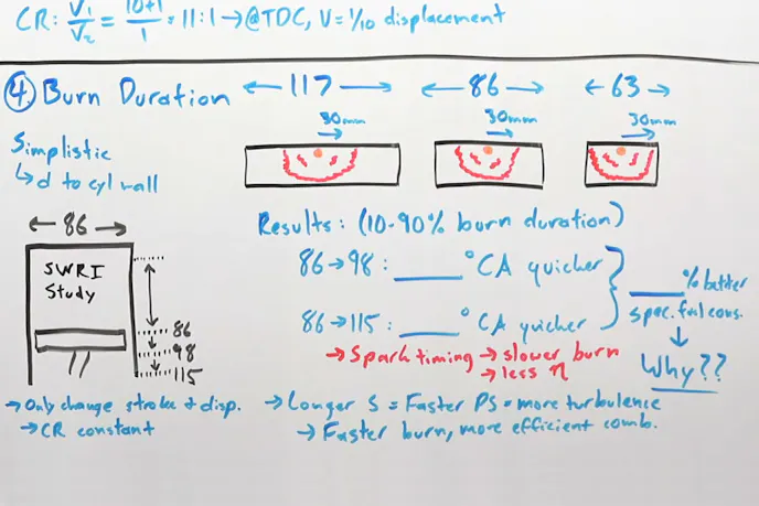 Those numbers may seem to not support the idea that the longer stroke is more efficient. However, Fenske points out the flaw in using the total swept area of the cylinder. “You have to factor in compression ratio and what the cylinder looks like at the time of combustion,” he explains.