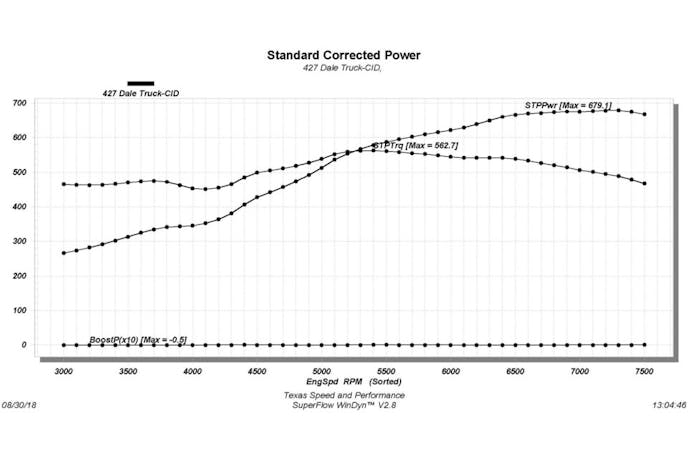 Holley Twin 450 liter-per-hour fuel pumps in a drop-in hat provide all the 93 octane go-juice the engine needs, while MSD ignition coils keep the candles lit throughout the RPM range. When put on the dyno, the engine produced a respectable 679 horsepower at 7,300 rpm, and 562 foot-pounds of torque at 5,300 rpm, which was a significant increase over the traditional composite intake manifold the engine was first run with.