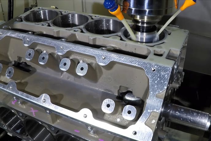 Starting with a new GM block, Texas Speed machined the block to accept Darton dry sleeves, which incorporate a stepped external geometry to prevent any movement under load. “We used high-end Darton sleeves that use a much harder material, as well as a thicker sleeve, compared to what is used in the factory blocks,” explains Doelling. “They feature a locator step on the bottom of the sleeve to alleviate any possibility of the sleeve moving.”