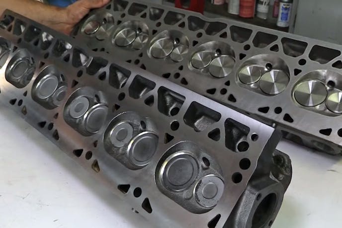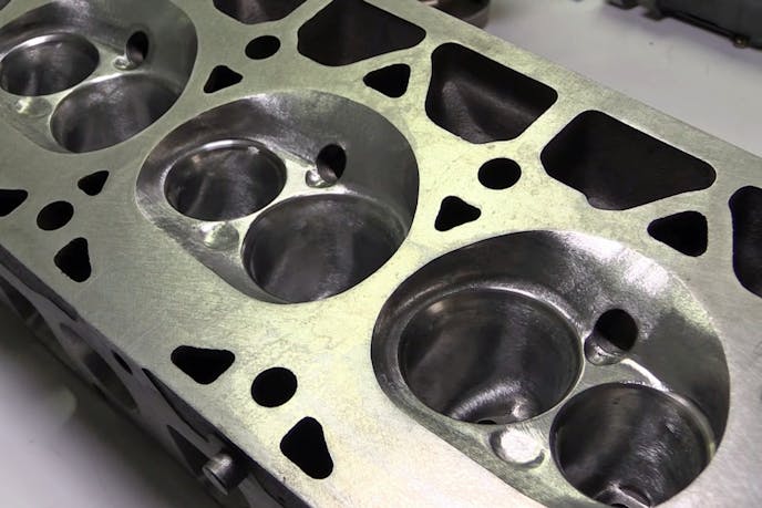 Not only were the intake and exhaust ports opened up and smoothed out, but so were the combustion chambers. By laying back the chamber walls and opening up the area around the spark plug, the volume of the chamber is significantly increased to 66cc. The valve seats have been opened up to accept 2.055-inch intake and 1.650-inch exhaust valves with 8mm stems.