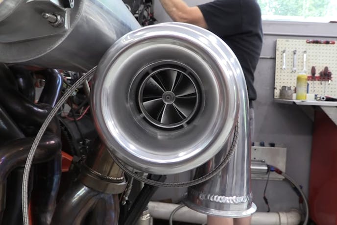 Feeding the intake ports is a completely custom log-style intake manifold, called “the Cannon”. It’s outfitted with an eBay 92mm throttle body and six 80lb/hr fuel injectors. The stainless-steel turbo manifold is also a custom-fabbed unit by Newcomer, designed for the On 3 Performance 76mm turbocharger. With a billet compressor wheel and 76mm exhaust exducer diameter, the turbo is rated at over 1,100 horsepower.