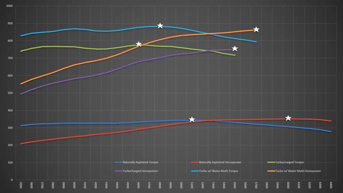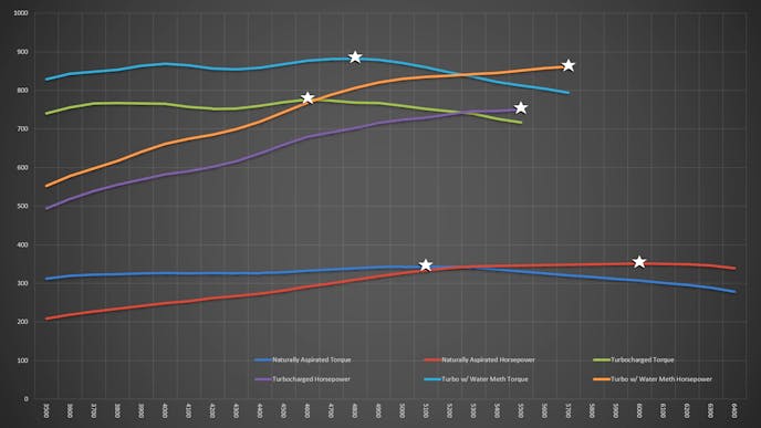 After connecting the Snow Performance water/methanol injection system with a number six injector and setting the activation threshold at 12 pounds of boost with the injection ramping in to full-injection at 17psi, the team filled the tank with Boost Juice and fired up the dyno. This time they pulled a little bit of timing, went to 21psi and spun the engine to 5,700 rpm.