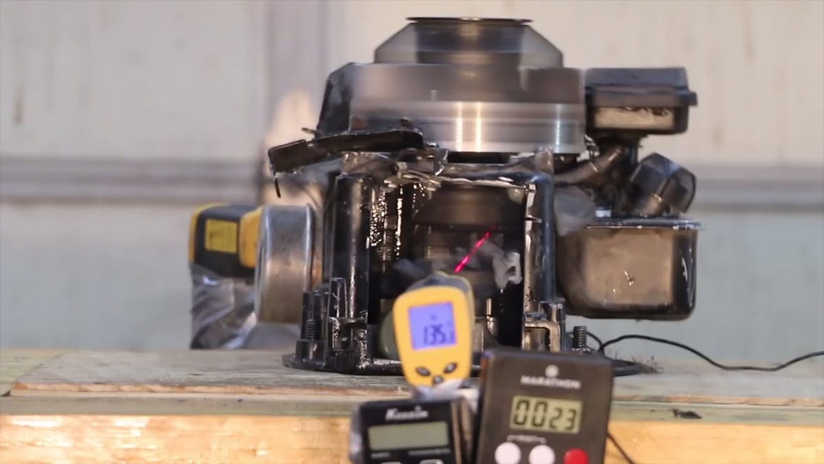 With the window into the engine’s depths opened up, the engine was fired up and run until it seized up again. At this point it did not have a major mechanical failure, although it lasted just shy of three minutes and created a lot of smoke and a lot of heat–nearly 500 degrees by the laser thermometer employed in the test. The engine was allowed to cool for one hour, broken loose, and fired back up again. It only lasted a short time until the end of its lifespan occurred–with connecting rod chunks flying everywhere. The video offers an interesting perspective of the failure. Check out the carnage!