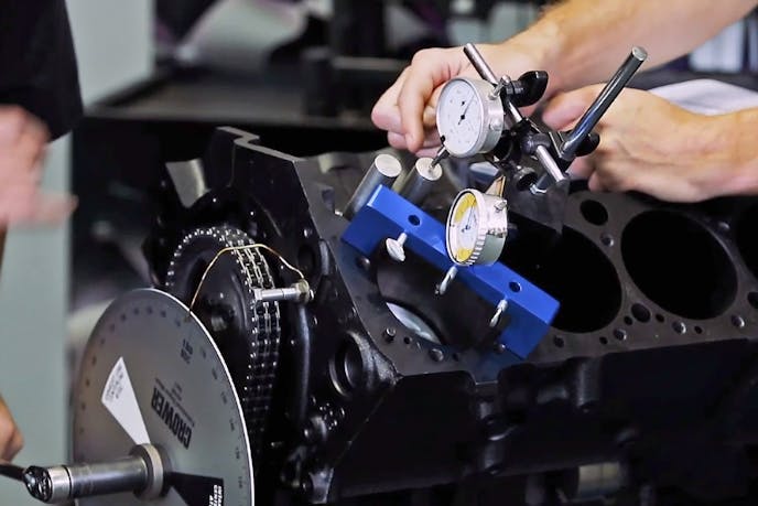 “To find top dead center, we’re going to use the .050 [fifty-thousandths of an inch] method, where we measure .050-inch of piston travel before and after top dead center,” Pulido explains. “The .050 method mitigates piston rock, and the crank can dwell for almost five or six degrees at actual top dead center.”