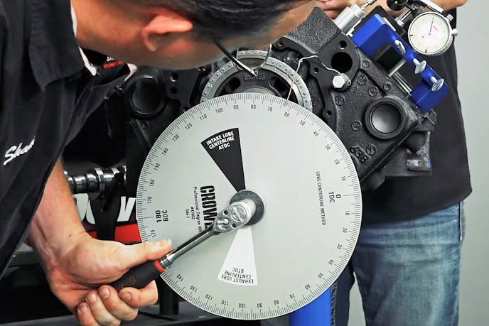 With a perfect baseline reference set, now it’s time to actually start measuring camshaft position. “You’ll need your cam card for the next step,” says Pulido. “For this particular camshaft, we have a lobe separation angle of 106 degrees, with one degree of advance in it, so we’re looking for 105 degrees, using the intake centerline method.”