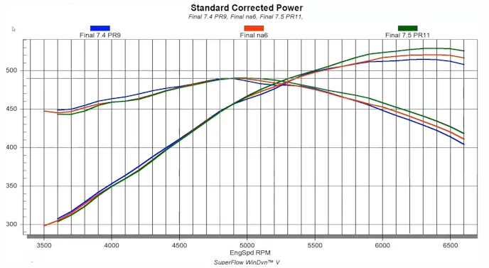 After installing the 7.500-inch pushrod, the graph showed distinct gains over both the 7.400- and 7.450-inch pushrods, starting at about 4,900 rpm with similar dips below that RPM as the 7.450-inch pushrods. “I even went as short as a 7.350-inch pushrod, and we saw a little bit of a loss up top, although it did pick up down low. It kind of “rocked” the curve like a rocker ratio or even a mild cam change would,” says Holdener.