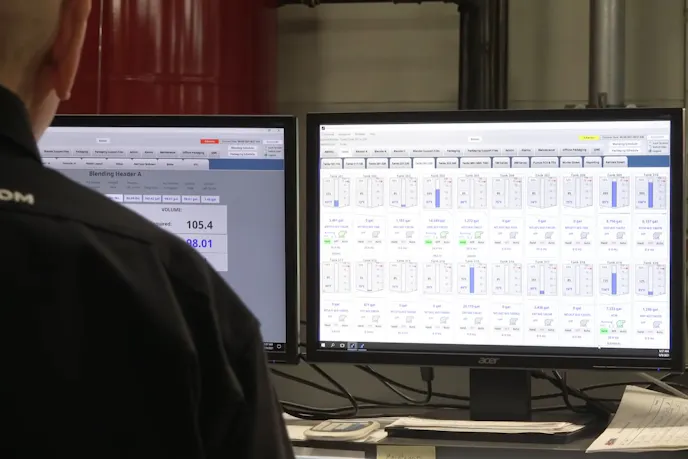 While the actual mixing of base oils and additives is all computerized, it’s not autonomous. A human is at the controls to ensure the blends are exactly to specifications. The beginning of a batch of product starts with the additive blend being mixed into a single “decant” tank.