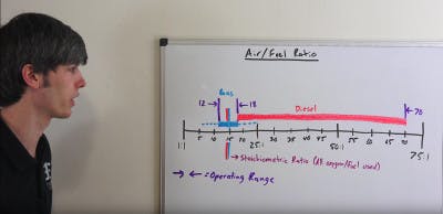 Jason starts by covering the difference between a spark ignition engine that uses gasoline and a compression ignition engine that uses diesel and the self ignition (autoignition) properties of each fuel. Spark ignition engines attempt to avoid the self ignition process by using a lower compression ratio, high octane fuel and a spark plug to ignite the air/fuel mixture. Diesel engines do not use a spark plug and do not mix the air and fuel on the intake stroke. Instead, diesel engines rely on a higher compression ratio to heat up the compressed air from the intake stroke past the self ignition temperature of diesel and then inject the fuel at the beginning of the power stroke.