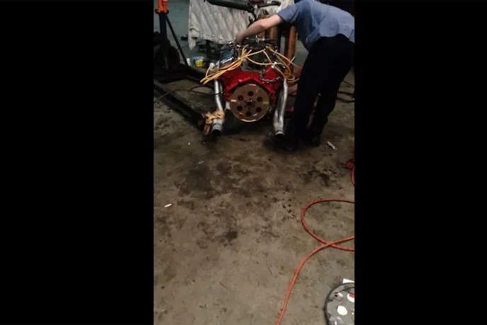 These backyard mechanics have the right (or wrong?) idea – getting this big-block 454 purring before they take the time to get it into the vehicle. While the concept of starting the engine without the transmission attached is one that’s foreign to most, these guys do take a moment to strap the engine to the hoist at the header collector – as if that’ll prevent any problems from cropping up during the fire-up process.