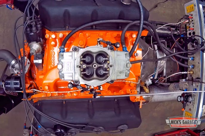 However, it’s soon apparent that something isn’t quite right as the engine struggles to get up to operating temperature. The demons are confirmed after the first pull only nets 442 horsepower – more than 100 off of Panaritis’ goal. After adjusting the dyno cell’s throttle linkage he makes another pull. This time, lean air-fuel ratios necessitate a carburetor adjustment. Upon entering the cell, he identifies a rocker noise, leading to him pulling off the passenger side valve cover and readjusting the offending valve.