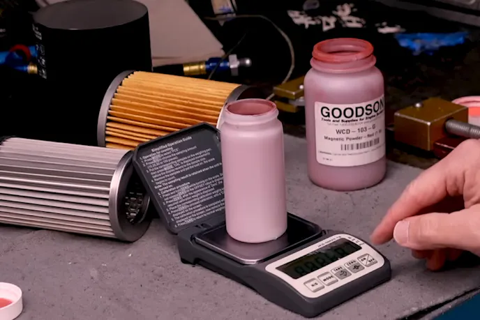 Since Speed doesn’t have the magic dust they use in the actual filter testing, he’s using an analog that is not uncommon to find in an engine – iron. Specifically, the fine iron powder used when magnafluxing parts. “We’re going to take 5 grams of that powder, mix it into 5 quarts of oil, and then put it into the engine,” Speed explains. They will take a sample of that oil before it goes into the engine, to be analyzed at SPEEDiagnostix. Then, the engine will be run for one hour on the engine dyno, making a full-power sweep every ten minutes of the hour runtime.