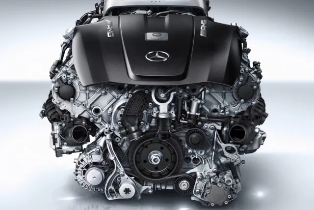 This twin-turbocharged 4.0-liter V8 engine from the AMG GT-C, however, is the exact opposite. The intake ports feed from the outside of the engine by two separate intake systems, and the exhaust ports are on the inside of the engine’s valley – hence the “hot inside-V” nomenclature. Each exhaust manifold has a turbocharger mounted to it, and both turbos are forward-facing, residing in the valley of the engine. The system utilizes two separate air-to-water intercoolers to keep the intake charge cool, along with a separate radiator for each intercooler. This configuration essentially isolates each bank of cylinders into its own four-cylinder engine.