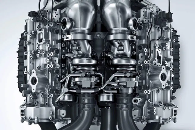 Looking at the engine from the front, the first advantage of the design is immediately obvious; it’s a compact, narrow setup. Normally, a twin-turbo V8 engine is a packaging nightmare, with all the hot-side and cold-side plumbing, not to mention the turbochargers themselves. The compact dimensions also allow for the engine block to reside entirely behind the front axle centerline, improving vehicle dynamics. In addition to the space-saving aspect of the compact engine layout, is the fact that all of the intake and exhaust tubing runs are kept short and efficient, keeping turbo lag to a minimum, and maximizing boost response.