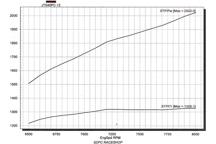 Running alcohol and 16 pounds of boost from the ProCharger F-1x-12, the big Rat motor pulled 2,023 horsepower at 8,000 rpm with a very flat torque curve on the SuperFlow dyno chart.