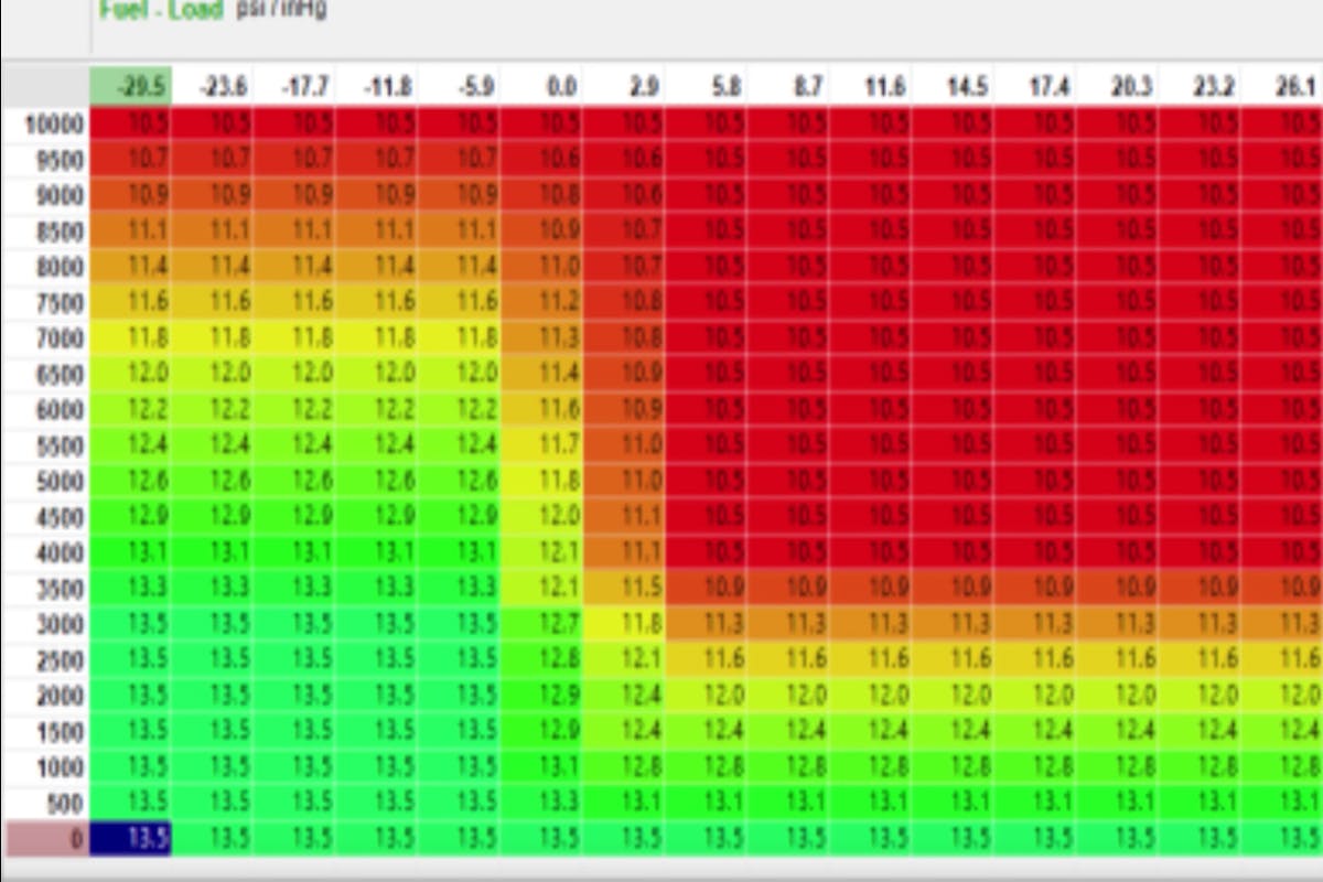 When tuning the target fuel map, rotary engines like to run rich compared to a piston engine. A good starting point for a rotary engine fuel map at idle is between 13.5:1 and 14.1:1, low 11’s at atmospheric pressure and when under boost, quickly richening up to a flat 10.5:1 through redline. You will notice that a rotary engine will make similar power at an AFR of 10:1 as it would at 13:1.