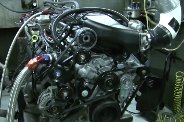 As Whipple develops supercharger systems by adapting different compressors to specific engine, the engineering team spends hundreds of hours creating miscellaneous parts and pieces to make each kit work with different vehicle platforms. This particular fitment necessitates that the supercharger be turned around; that is, the typical entry point at the rear of the supercharger is placed in the front, and a jackshaft is subsequently used to transfer the power to the gearset. There are a number of advantages to this design, most notably cleaning up the airflow, as the inlet can be fashioned with a 90-degree turn into the blower rather than the 180-degree turn required in other fitments that use the inlet in the rear of the engine.