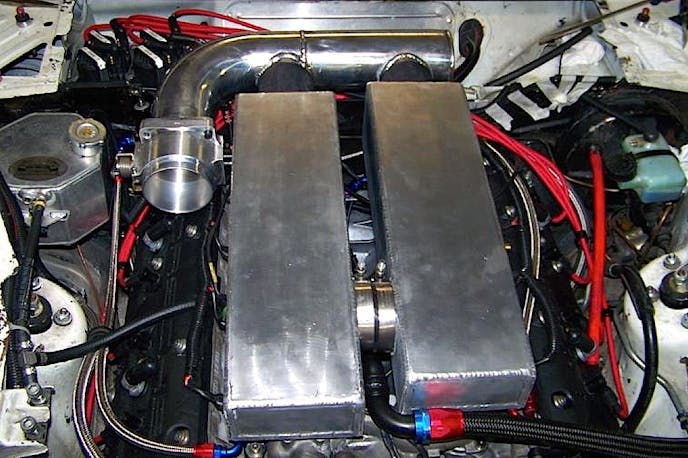 Providing the boost is a Vortech V-7 YSi supercharger that is routed through a large air-to-air intercooler manufactured by Bell Intercoolers. A custom cogged belt drive works off a fluid-filled damper.