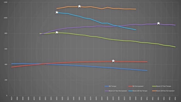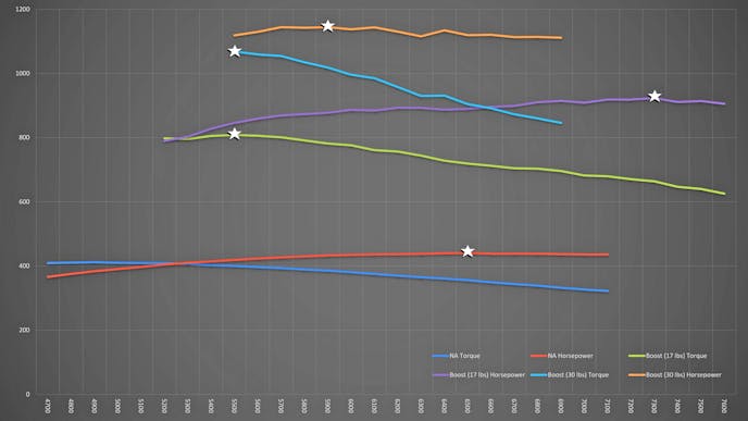 Getting to the dyno testing, the first thing the team did was test the combination naturally aspirated. The resulting 440 horsepower at 6,500 rpm. That’s a 120-horsepower increase over the engine in factory form, and that is with the one-point loss in compression ratio over the stock 5.3-liter engine. That said, after sorting out the tune up on 17 psi, like the first test, the dyno showed a much-improved 923 horsepower at 7,300 rpm and 808 lb-ft of torque at 5,500 rpm.