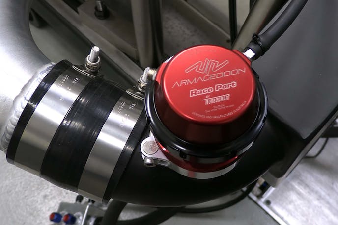 Using a pair of cast upswept turbo manifolds with a T4 exhaust housing flange and integrated wastegate V-band flange, the kit positions the turbos above the engine, making packaging concerns more vertical than lateral as the turbos sit evenly with the top of the factory intake manifold. For turbos, Rochau went with a pair of 64mm turbos with a billet 10-blade wheel compressor, that is still in the prototype phase. “They are really similar to a Garrett GTX3582R turbo, which is what we use on the main line of Armageddon systems,” explains Rochau.