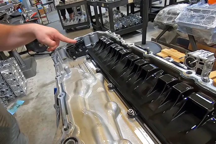 Looking inside the stock LT2 dry-sump oil pan, the scavenging system is an imposing sight, with two separate scavenging stages, in an odd arrangement. The unit’s size leads the team to wonder if it would interfere in a stroker crankshaft application.